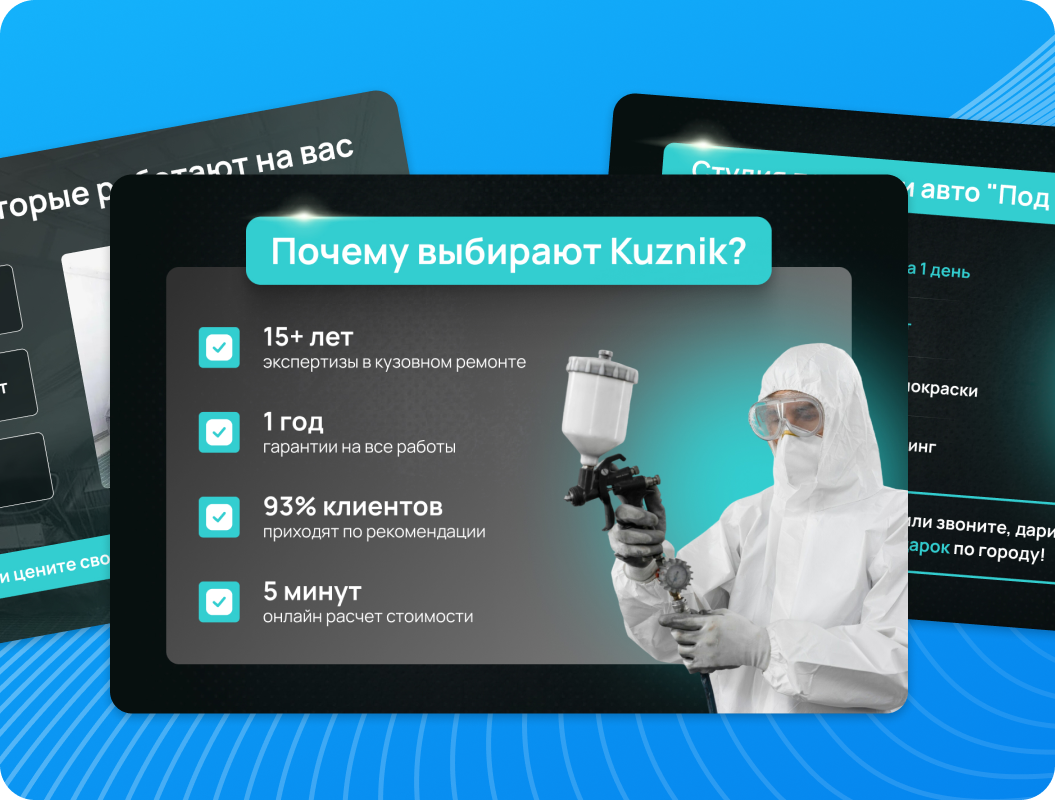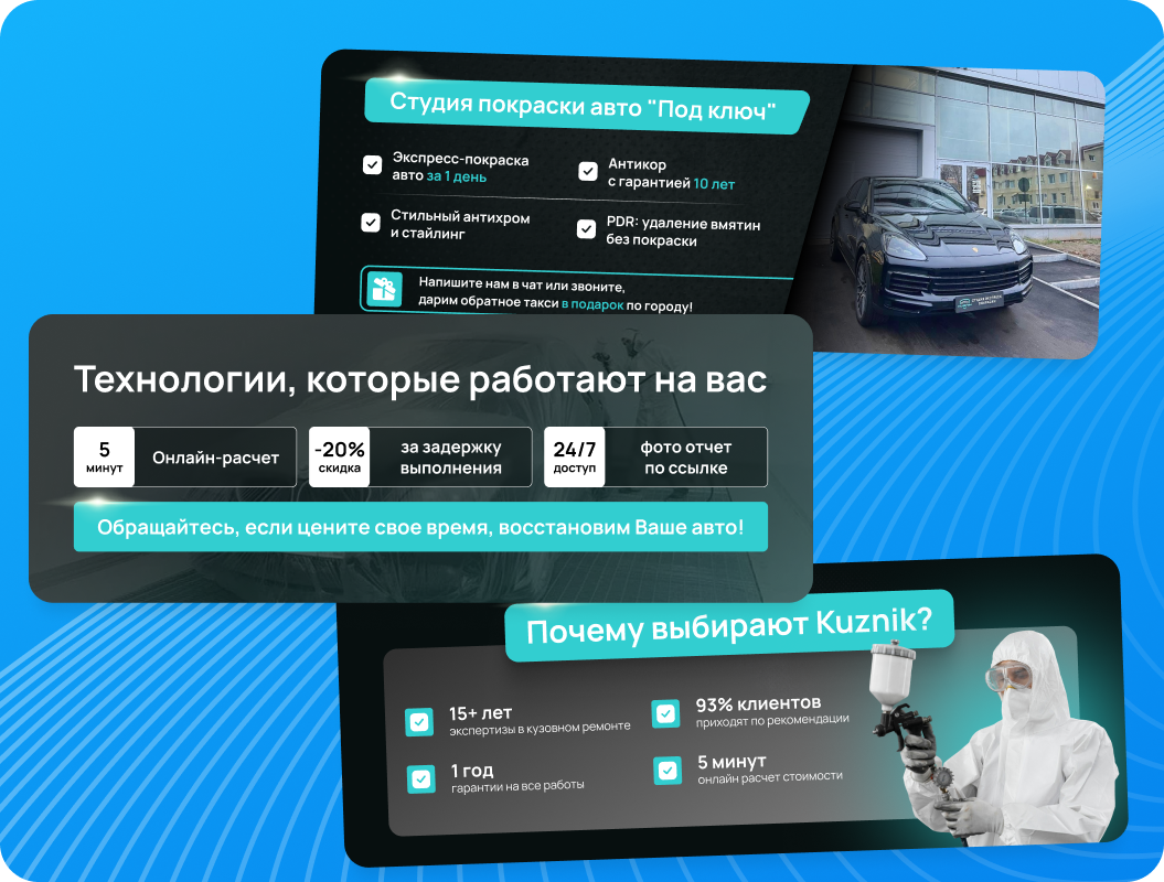 Студия «КУЗНИК» из Чебоксар специализируется на экспресс-покраске автомобилей, антикоррозийной обработке, антихроме и удалении вмятин PDR. Ключевая особенность бизнеса — премиальное позиционирование. Средний чек здесь составляет 40 000 рублей.
