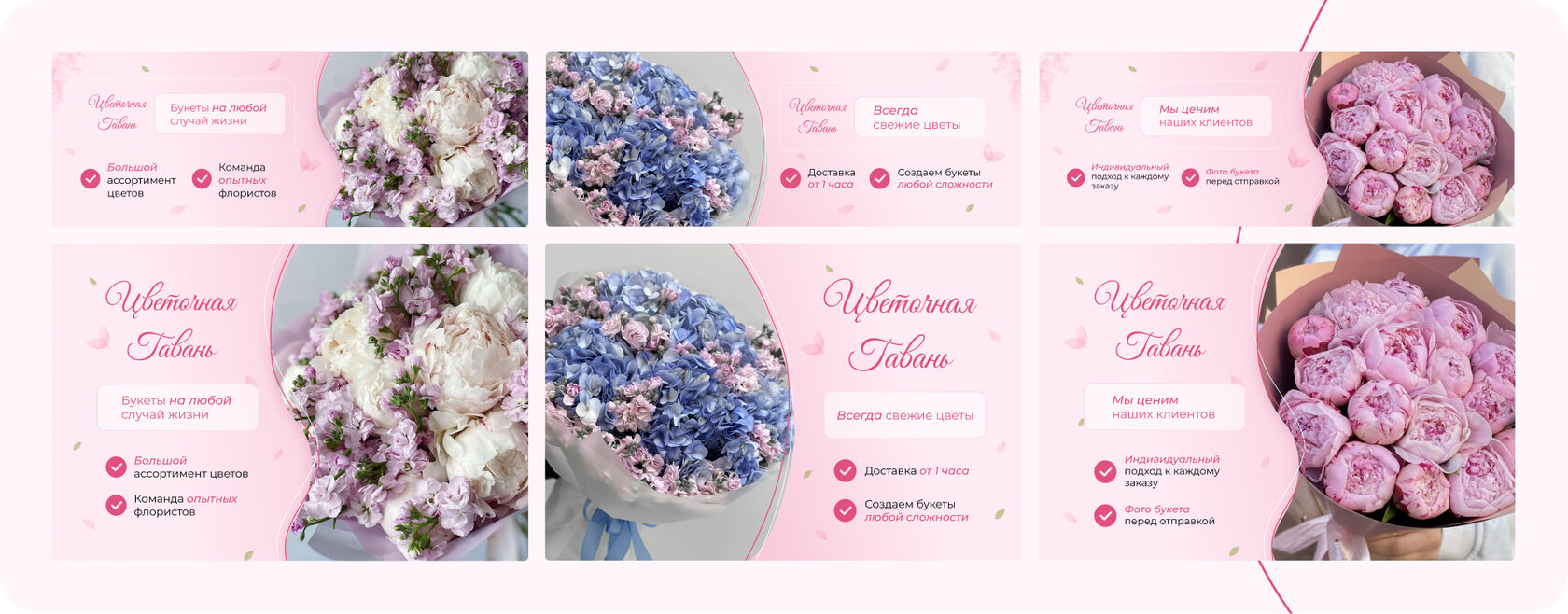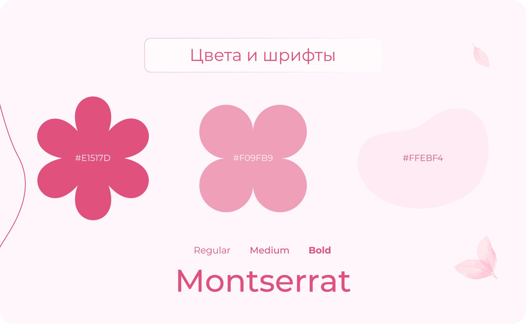 Весь дизайн выполнены в светлых розовых оттенках, создающих ощущение нежности, романтики. Добавлены графические элементы, имитирующие лепестки цветов и волнистые линии.
